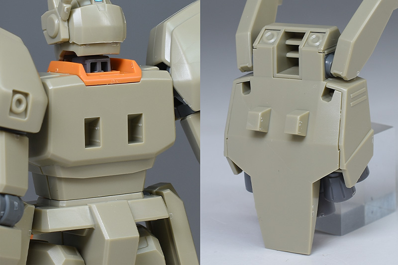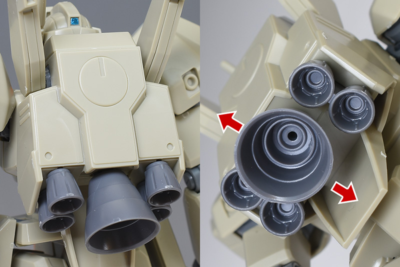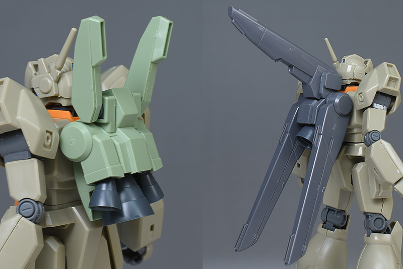 バックパックは本体とは角型の2ダボ接続でジェガンバリエ機共通。なので逆シャア版はもちろん、D型のバックパック、スタークジェガンなどのバックパックなども装備可能です。