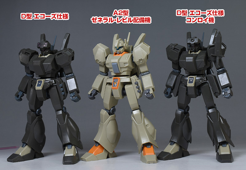 HGUCジェガンD型(エコーズ仕様)、エコーズ仕様コンロイ機と並べて。エコーズ仕様はA2型以上に特別仕様機感が強く、ダークブラウン基調のカラーリングで隠密部隊のような雰囲気があります。