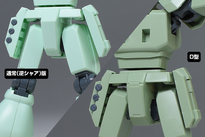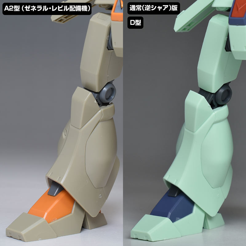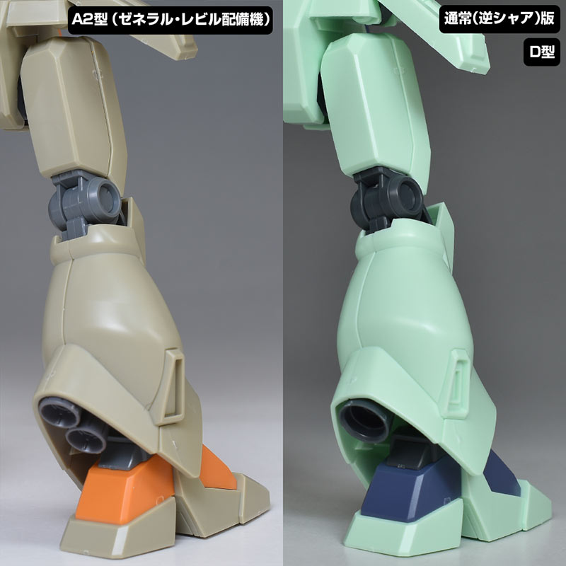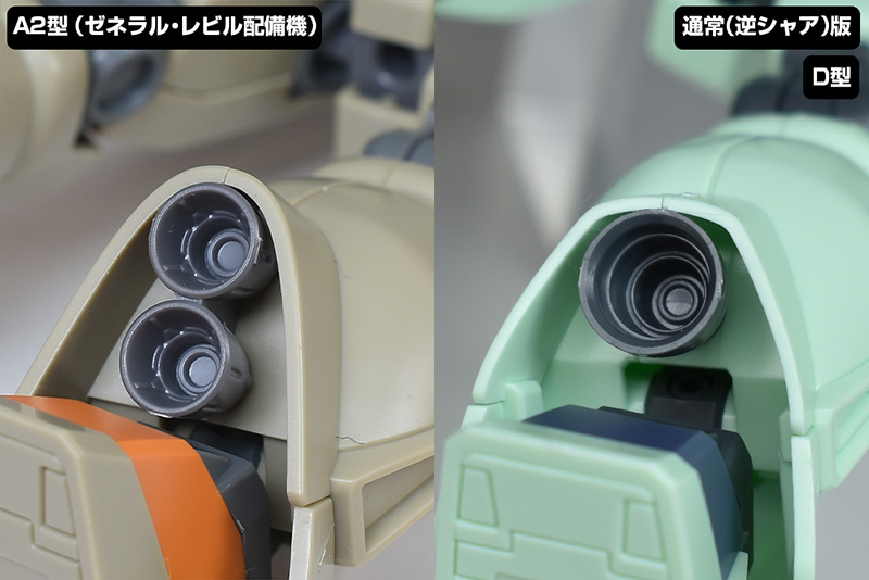 脚部を通常版、D型と比較して。大部分は通常版、D型と同じですが、膝から下の外側装甲がA2型用に新造。外側にアポジが追加され、後部バーニアも2口タイプで機動性の向上を感じさせる造りになっています。