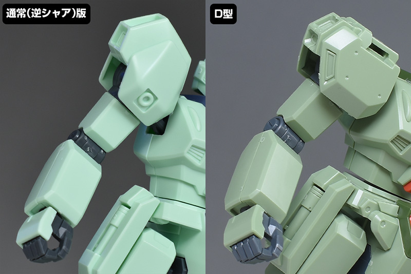 腕部を通常版、D型と比較して。通常版と殆ど同じに見えますが、ショルダーアーマーの前面装甲がA2型用に新造。少し厚みのある装甲に変化しています。通常版では前面だったアポジ付きの装甲パーツは後面に使用されています。上腕以下は通常版、D型共に同じ。