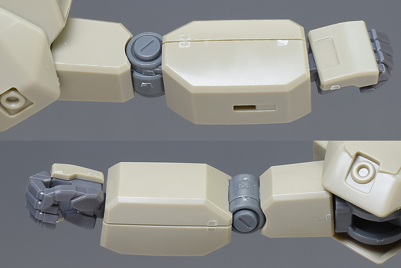 上腕は筒型で合わせ目はなし。前腕は前後の組み合わせですが、側面の合わせ目は段落ちモールド化されています。