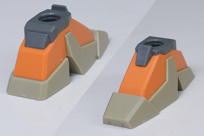 ソール部。ジェガン特有のエッジの効いたデザインで造形。重厚感が感じられるフォルムになっています。脚甲はオレンジでインパクトのあるカラーリング。つま先のモールドは白く塗り分けが必要です。