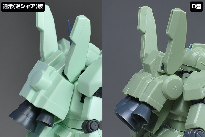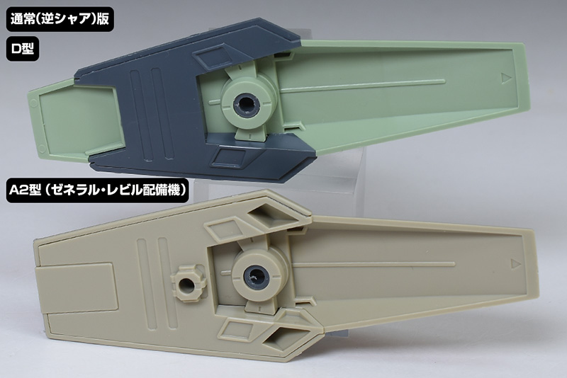 バックパックを通常版、D型と比較して。シルエットは似ていますが、上部のフレキシブルスラスターや表面装甲がA2型用に新造。下部バーニアも2口のものに変化しています。