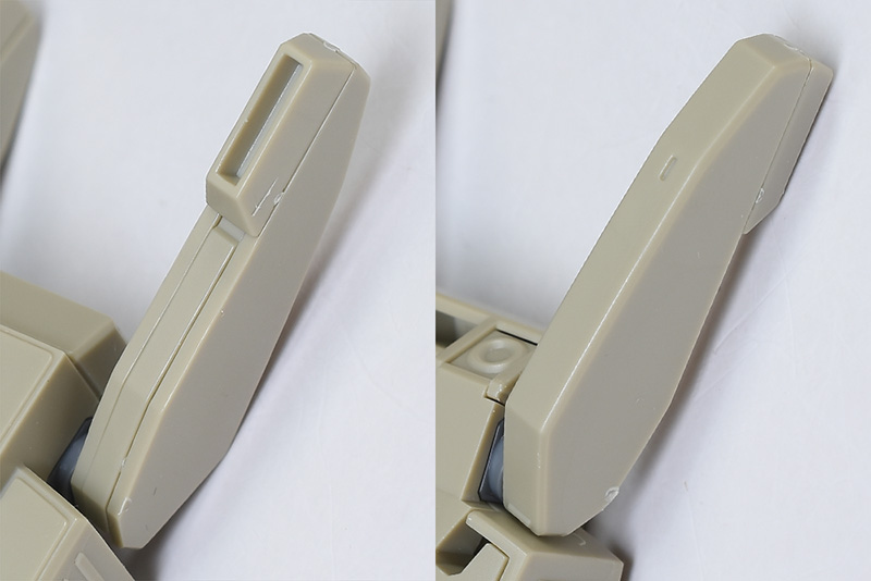 サイドアーマーは他のジェガンと同じ。右がサーベルホルダー、左が3基のハンドグレネードです。ハンドグレネードのハッチは簡易的ですが展開可能。取り出す際の表現がしやすくなっています。
