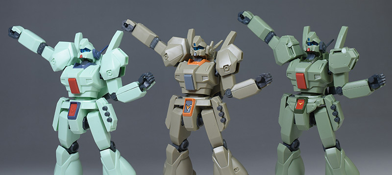 F91に登場するHGUCジェガンノーマルタイプ(F91Ver.)、HGUCジェガンAタイプ(F91Ver.)、HGUCジェガンBタイプ(F91Ver.)とも並べて。F91登場ジェガンはカラーリングこそ同じですが、各部形状が細かく違っています。