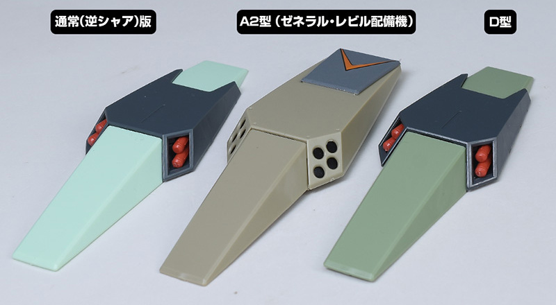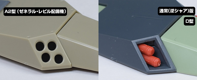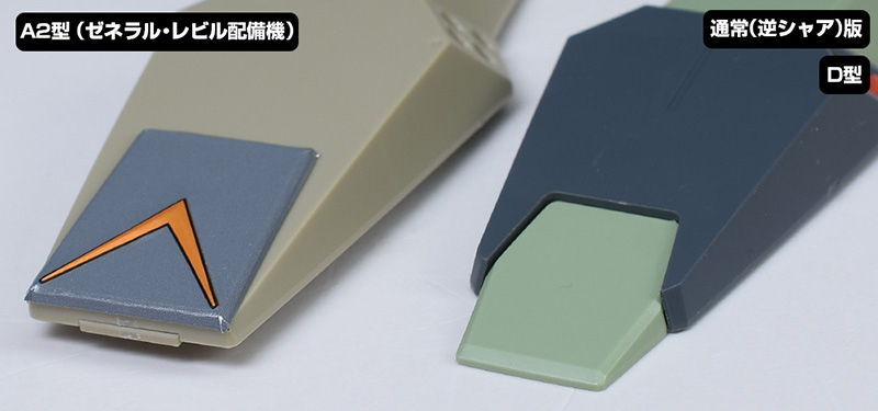 頭部を通常(逆シャア)版、D型と比較して。A2型ですが、大部分はD型と同じ。ただし左側頭部のバルカンポッドはA2型用に新造。縦長のセンサー付きでアンテナも太く、よりメカニカルに再現されています。