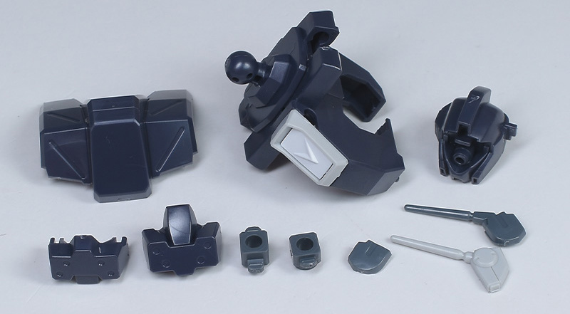 シールド、汎用バズーカ、ビームライフル(右持ち用、左持ち用)、武器持ち手(右、左:手甲なし)、ビームサーベル刃(短、長)、アイテム保管用のプレートが付属。