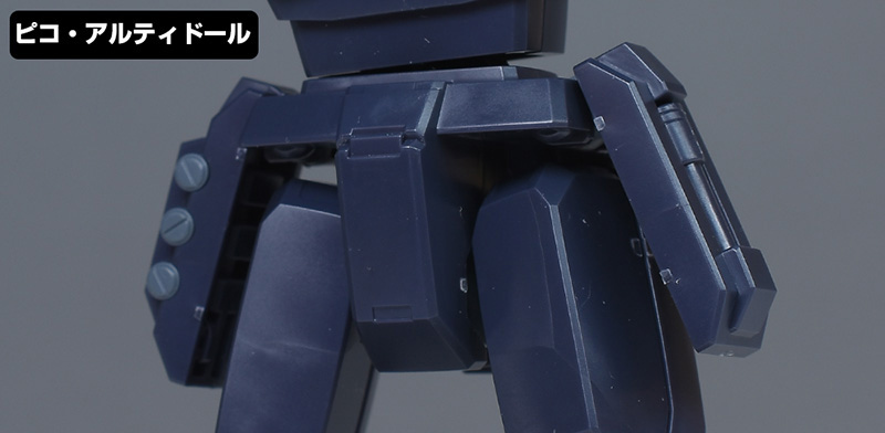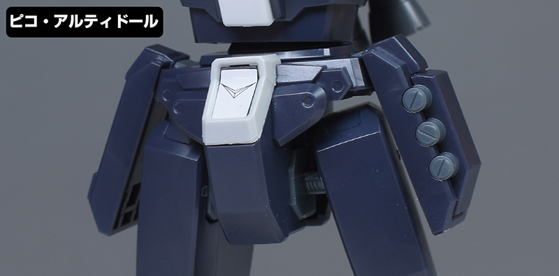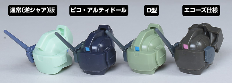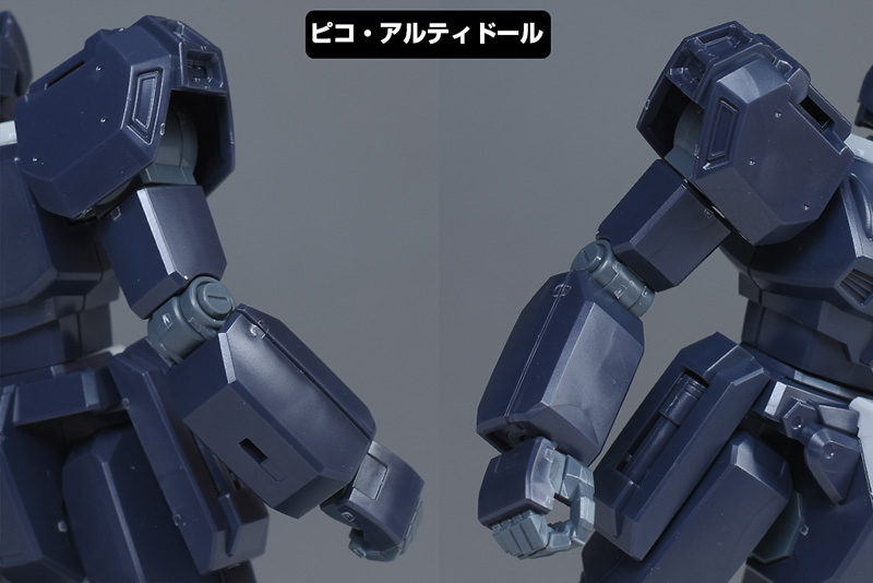 腕部をD型、逆シャア版、エコーズ仕様と並べて。ピコ・アルティドール専用機はD型、エコーズ仕様と同形状。上部にラッチを持つメカニカルなショルダーアーマーを装備しています。上腕以下の形状は各種とも同じ。肩部のダクトはホワイトとグレーに塗り分けが必要です。