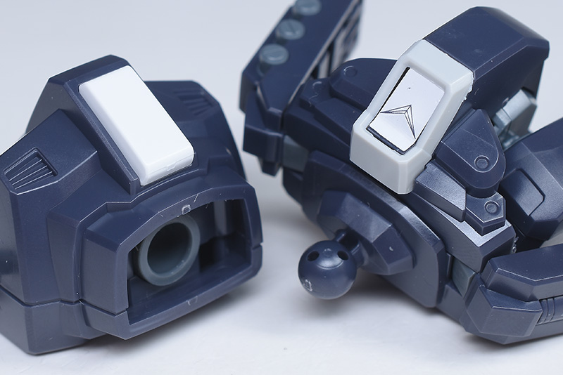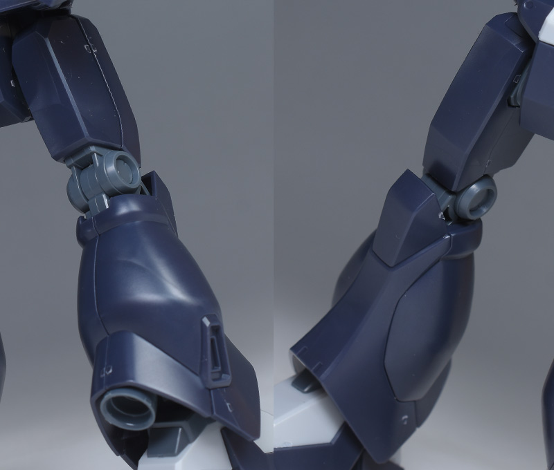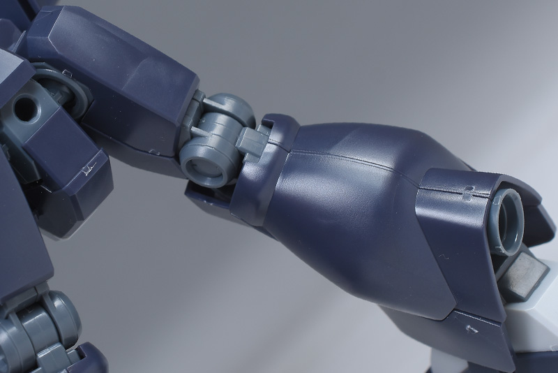 上腕は筒型パーツに縦角型ポリキャップを差し込む構造で合わせ目はなし。前腕は前後の組み合わせですが、側面の合わせ目は段落ちモールド化されています。