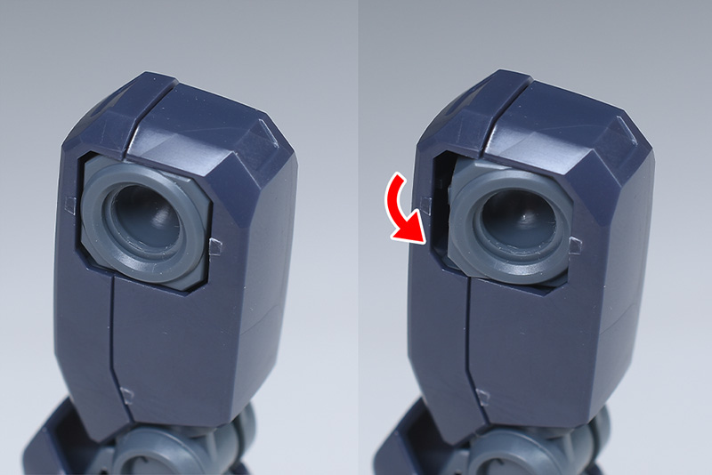 シールドはジョイントパーツを介して前腕に固定。ダボが深くしっかりと差し込めるため、組み付けてもポロリすることがなく保持が安定しています。ロールするので干渉も避けやすくて良いですね。