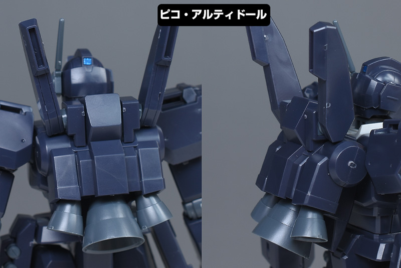 バックパックを逆シャア版、エコーズ仕様と並べて。ピコ・アルティドール専用機はエコーズ仕様と同じD型仕様。逆シャア版とはシルエットは似ていますが形状が異なり、メカニカル且つコンパクトに造形されています。