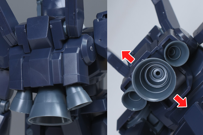 バックパック基部は前後の組み合わせで、側面の円形モールドの部分に合わせ目ができます。下部にはスリットモールド入りの3基バーニアが造形。中央の大型バーニアはポリキャップに1ダボ接続で少し上下します。3基とも内部は白く塗り分けが必要。