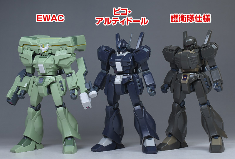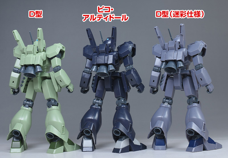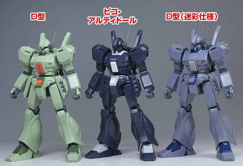 HGUC ジェガンD型、HGUC ジェガンD型(迷彩仕様)と並べて比較。どれもカスタムされていないD型なので形状は同じ。ですがカラバリでも並べるとかなり印象が違って見えます。ピコ・アルティドールは特に一部の配色(ホワイト)が目立つ仕様。