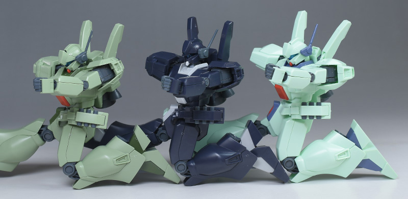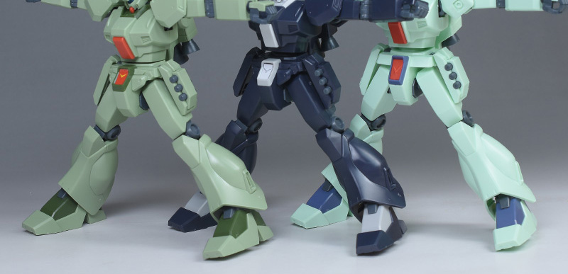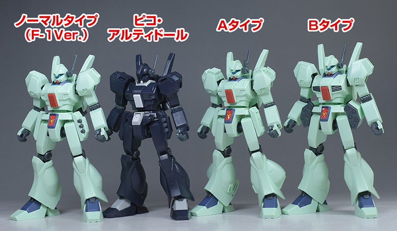 F91に登場したジェガン(HGUC ジェガンノーマルタイプ、HGUC ジェガン Aタイプ、HGUCジェガン Bタイプ)とも並べて。これらはD型とは異なるJ型(ノーマルタイプ)、R型(Aタイプ)、M型(Bタイプ)で各部形状が細かく違っています。