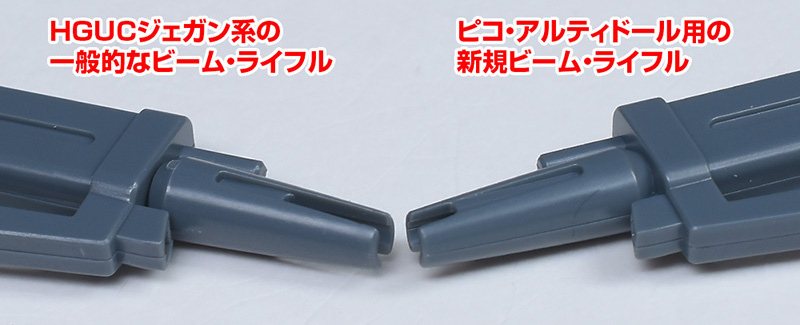 続いてこのピコ・アルティドール専用機用に新造されたビーム・ライフル。形状は先程のビーム・ライフルとほぼ同じですが、こちらは砲口部分が別パーツ化されておらず、完全モナカ割となっています。