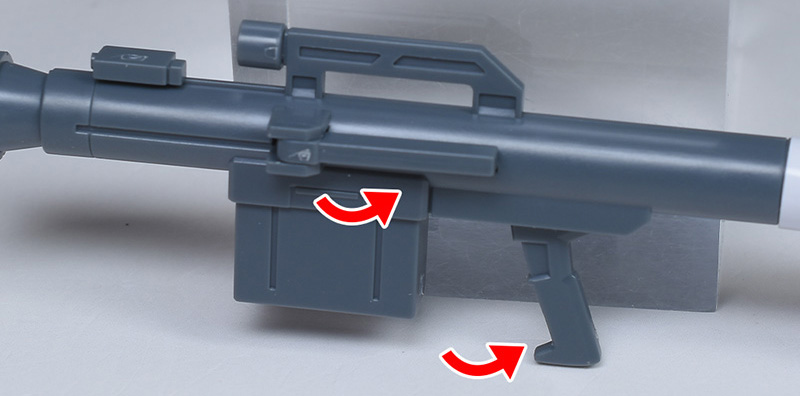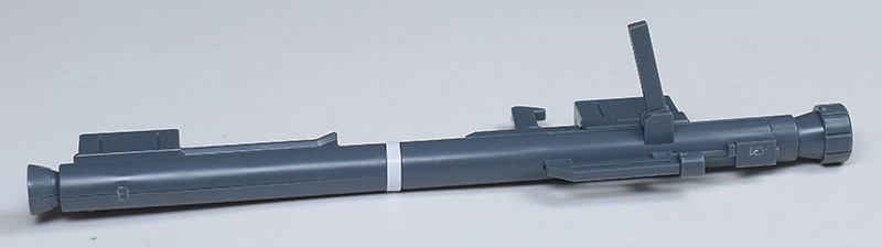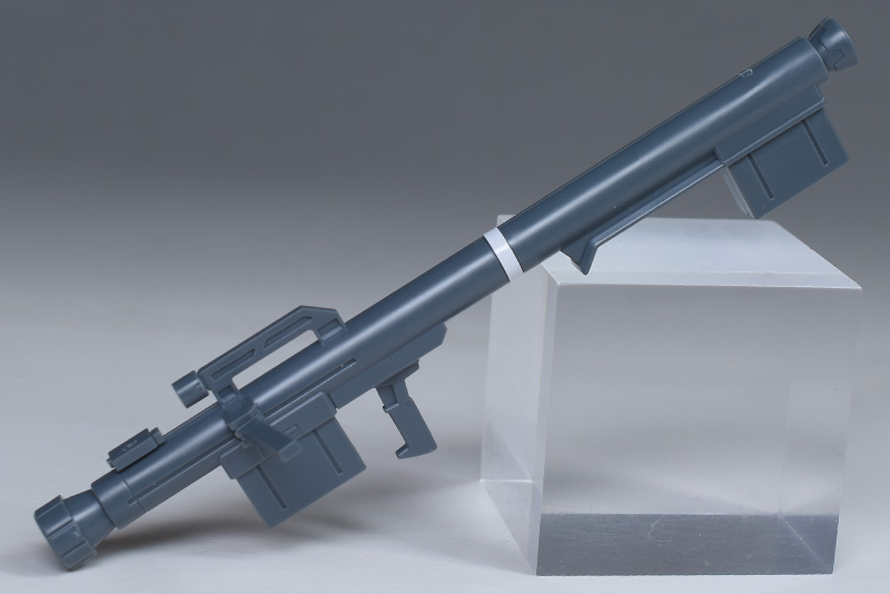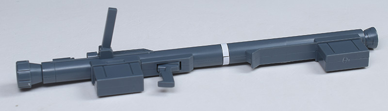 汎用バズーカ。実弾を発射する無反動砲です。グリップに予備弾倉を配し、複数種の弾頭に対応した実体弾携行火器。こちらもD型やエコーズ仕様に付属しているものと同形状ですが、砲身中央のモールドを白いシールで色分けするようになっています。