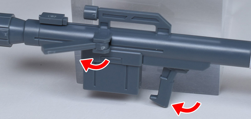本体部分は左右の簡単な組み合わせで上下に合わせ目ができます。銃口部分は別パーツ化。銃身下部のマガジン(Eパック)の脱着ギミックはありません。
