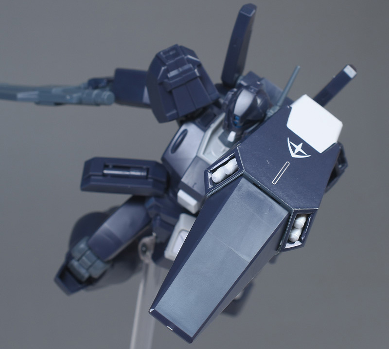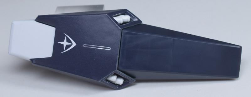 シールド。防御用の実体盾です。攻撃を弾いたり逸らしたりするための構造や材質を採用しているとのこと。左右には2連装ミサイル・ランチャーを装備。こちらもD型や逆シャア版、エコーズ仕様に付属しているものと同形状ですが、上部を白、中央部分をダークブルーのシール(連邦マーク付き)で色分けするようになっています。