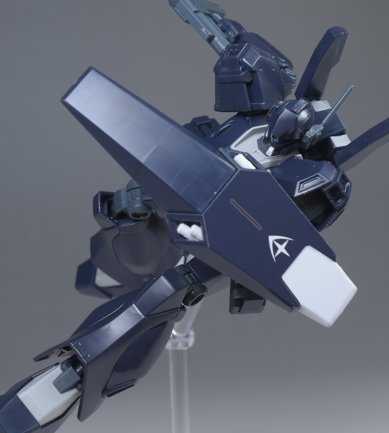 成形色はダークパープルを基調に、顎や腹部、シールドのミサイルランチャーにホワイト、襟や腰部、脚甲などにくすみのあるホワイトを配色。その他、内部や関節、各部バーニア、武装類などがグレー成形色での再現となっています。