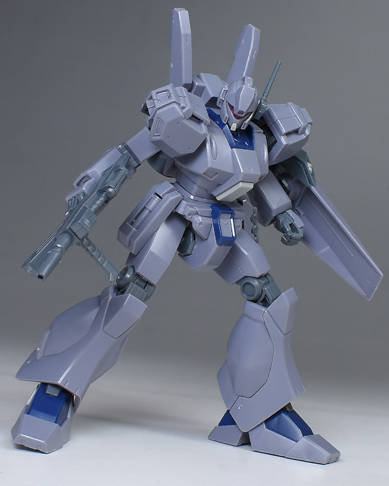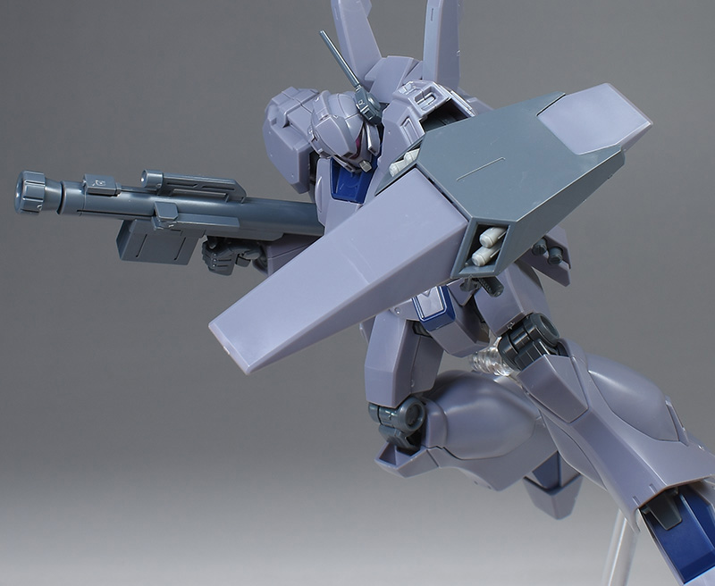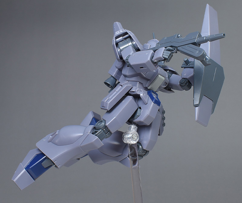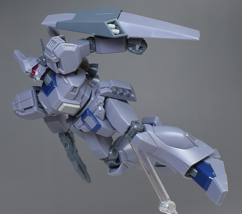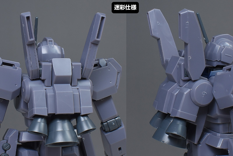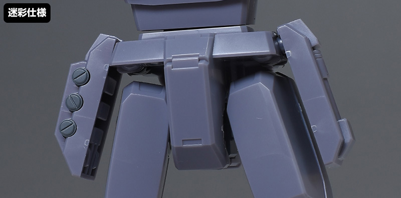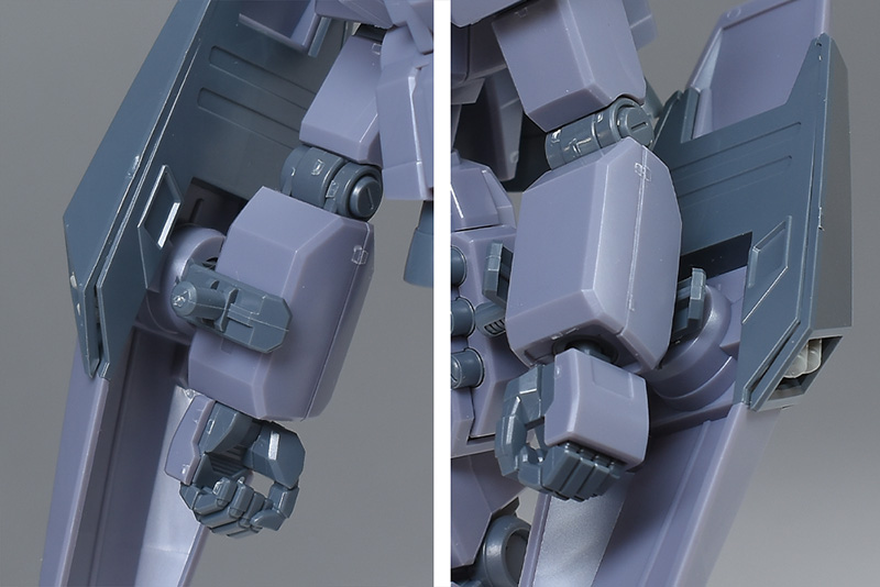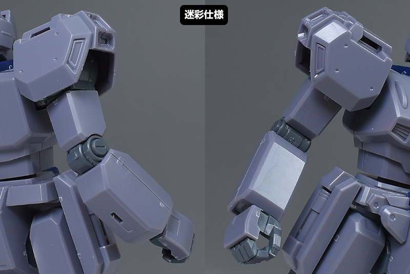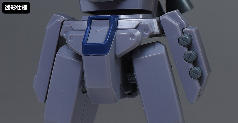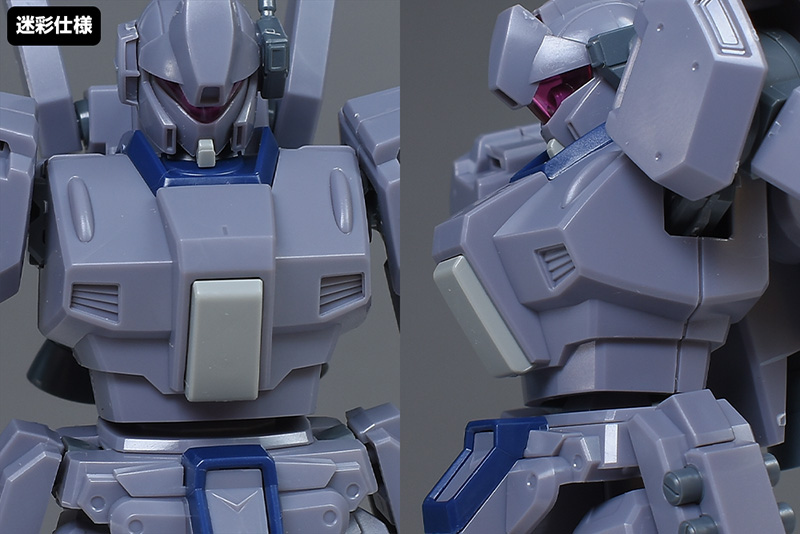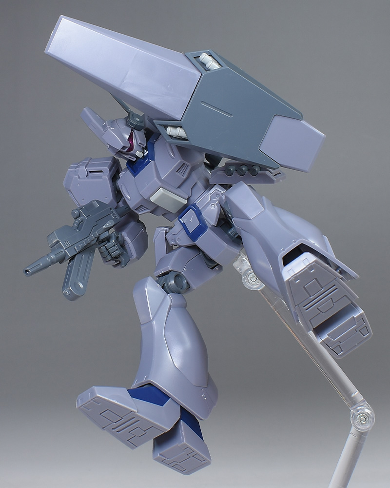 成形色は迷彩仕様特有のパープルグレーを基調に、襟や腰、脚甲などにダークブルー、顎や腹部、シールドのミサイル・ランチャーなどにライトグレーを配色。その他、内部・関節、各部バーニアや武装類がグレー成形色での再現となっています。