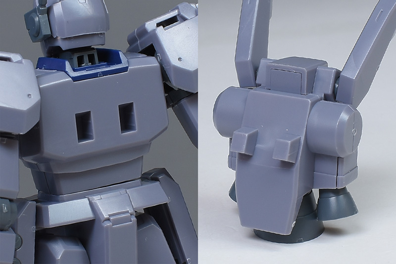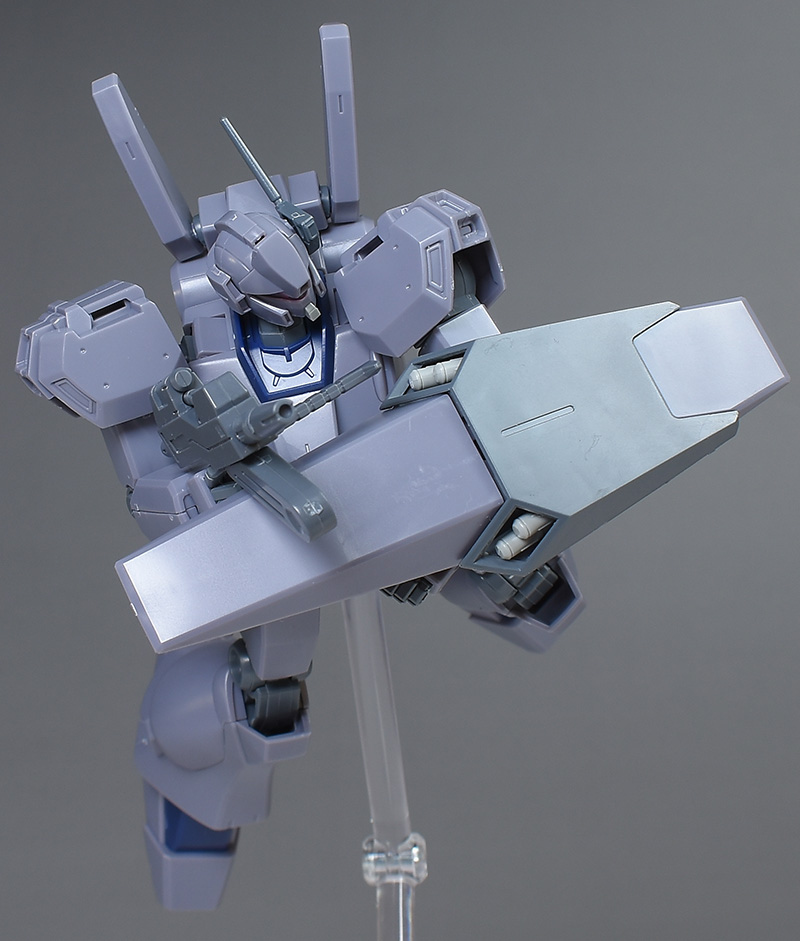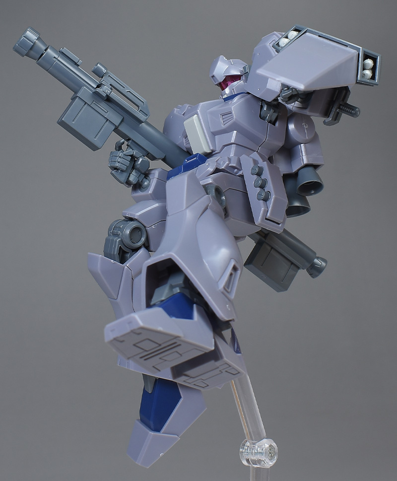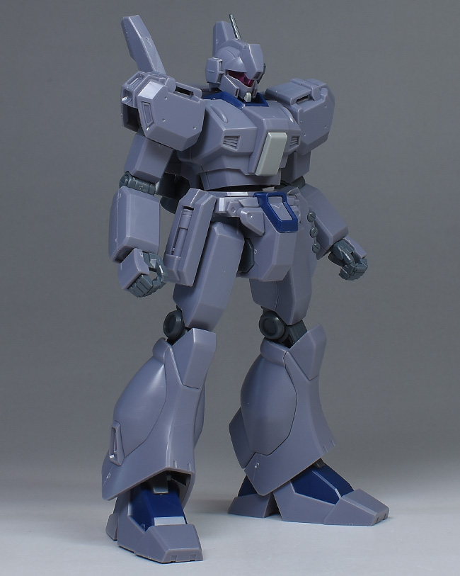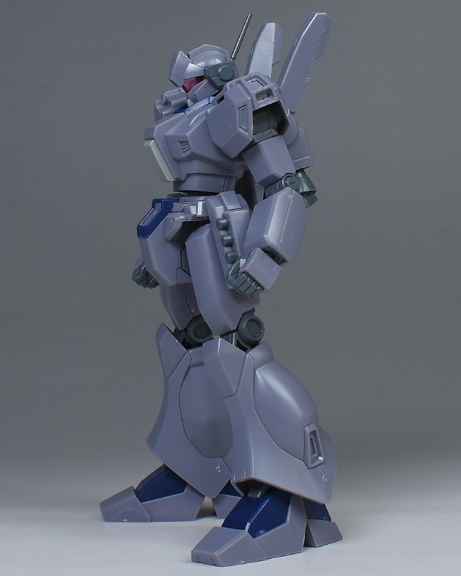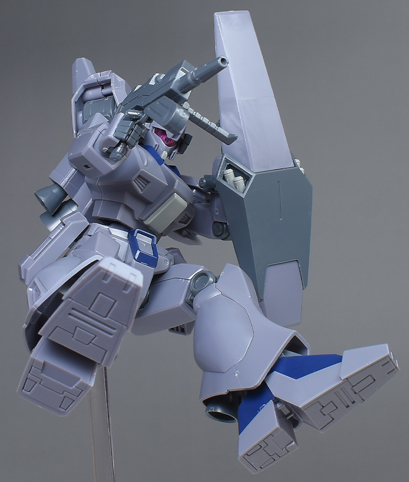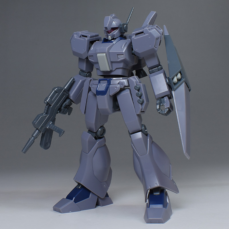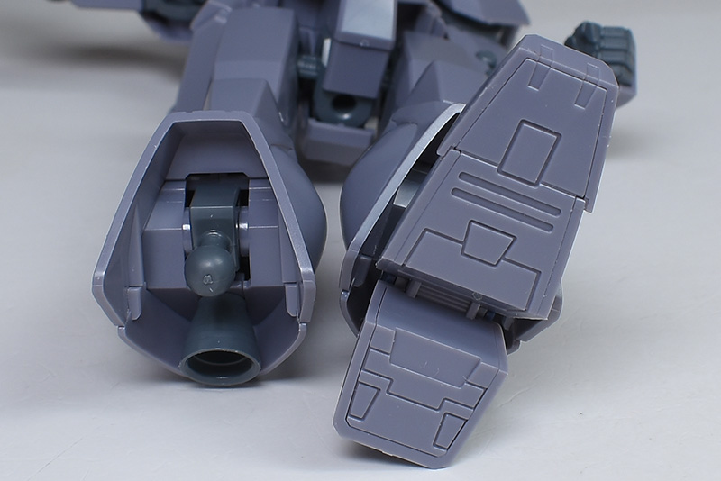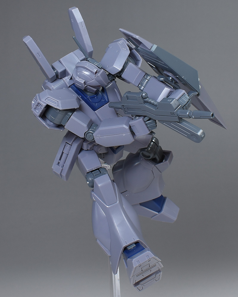 成形色は迷彩仕様特有のパープルグレーを基調に、襟や腰、脚甲などにダークブルー、顎や腹部、シールドのミサイル・ランチャーなどにライトグレーを配色。その他、内部・関節、各部バーニアや武装類がグレー成形色での再現となっています。