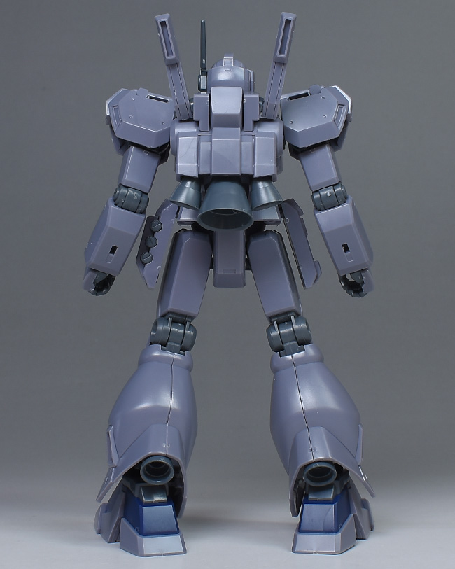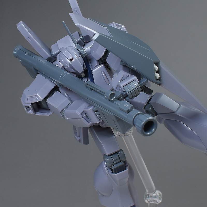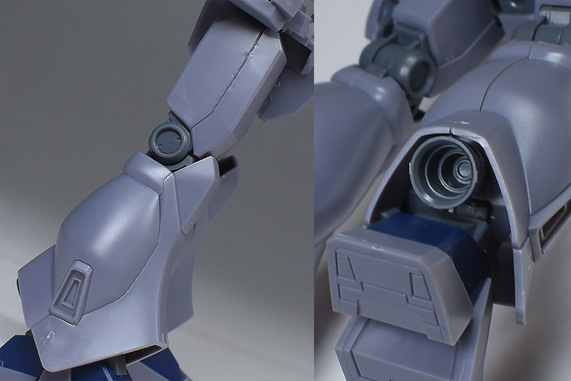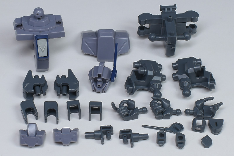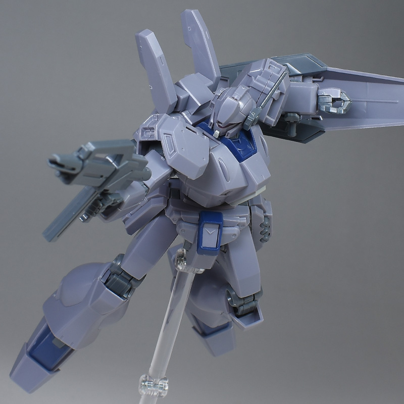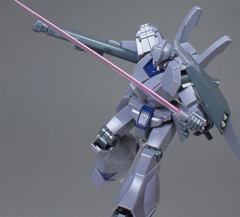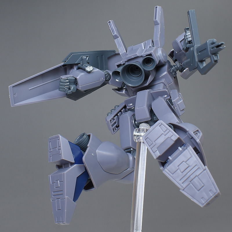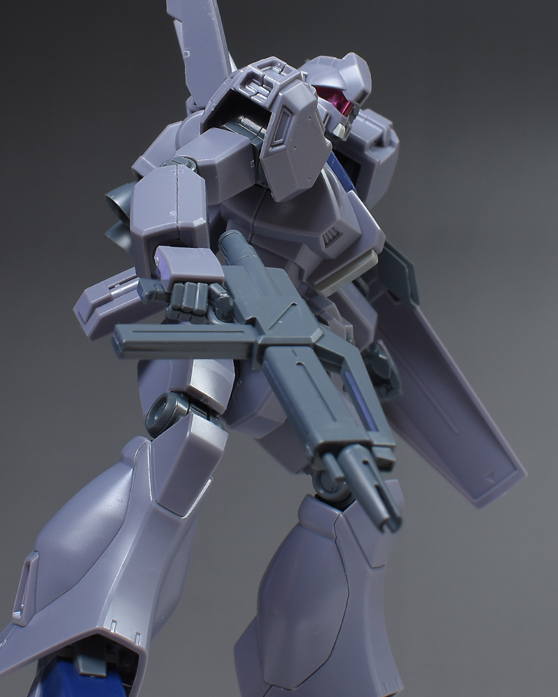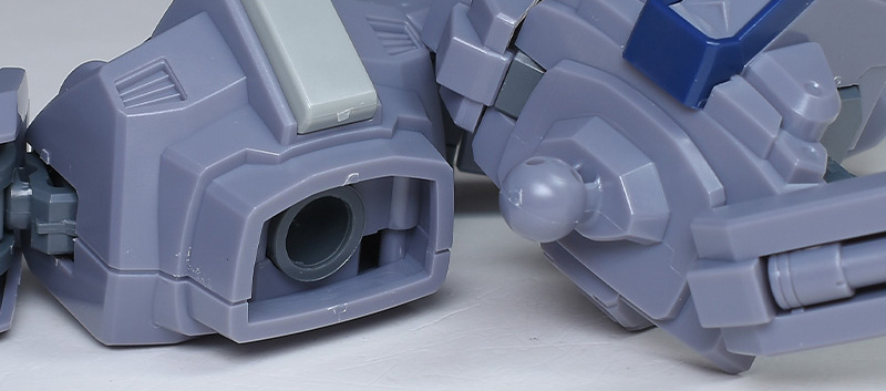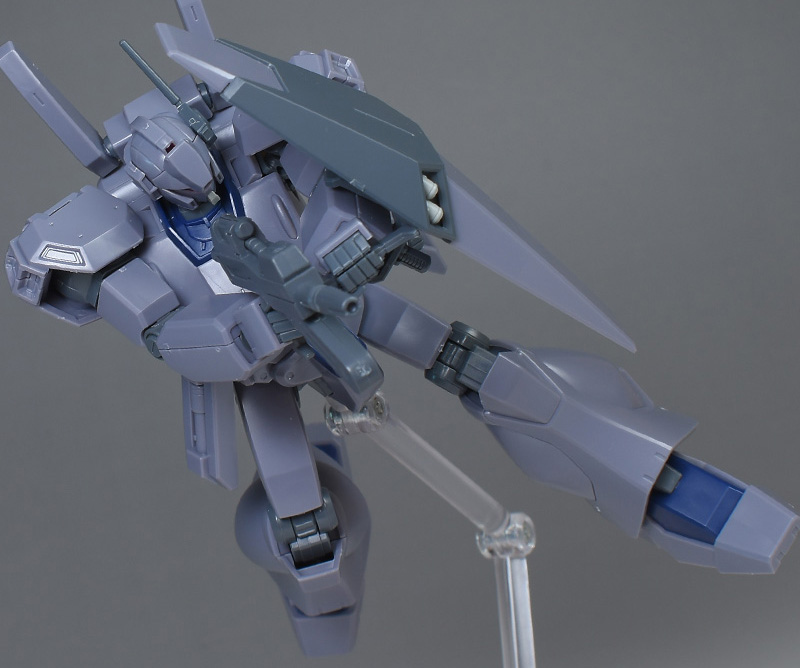 成形色は迷彩仕様特有のパープルグレーを基調に、襟や腰、脚甲などにダークブルー、顎や腹部、シールドのミサイル・ランチャーなどにライトグレーを配色。その他、内部・関節、各部バーニアや武装類がグレー成形色での再現となっています。