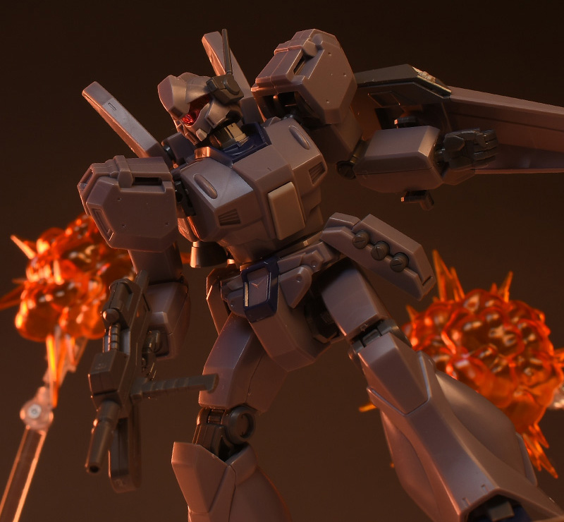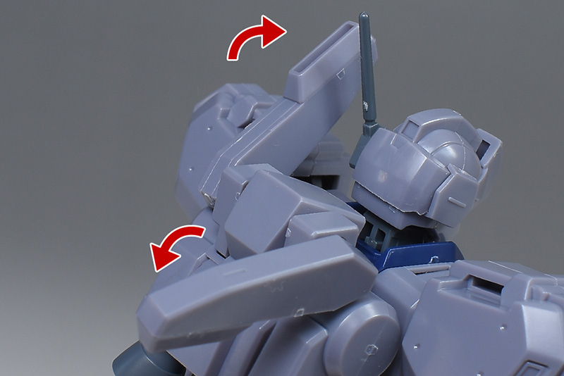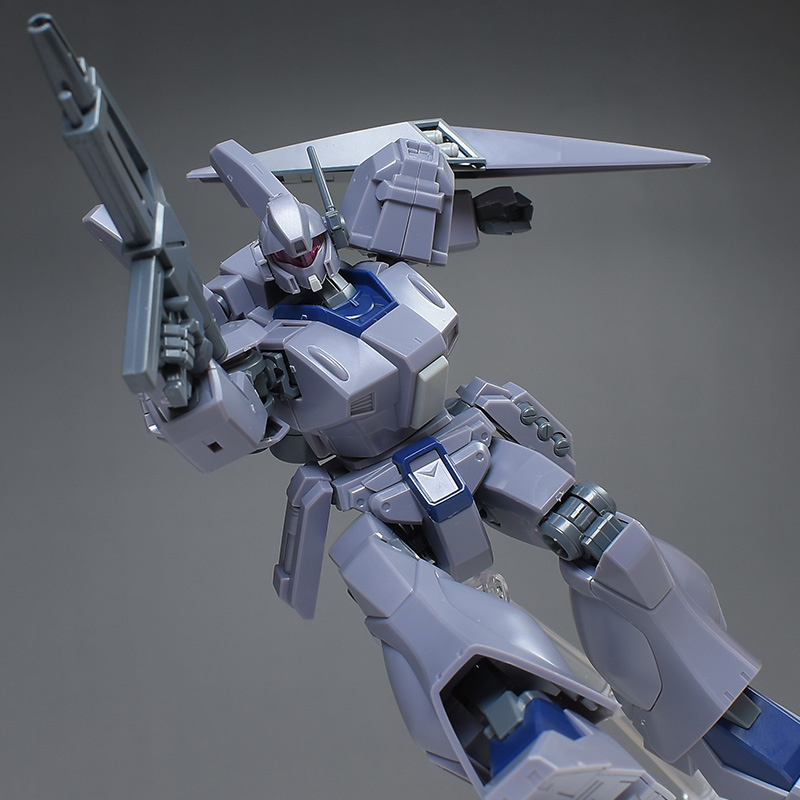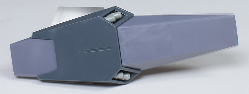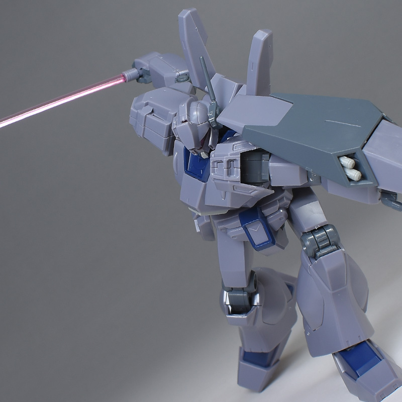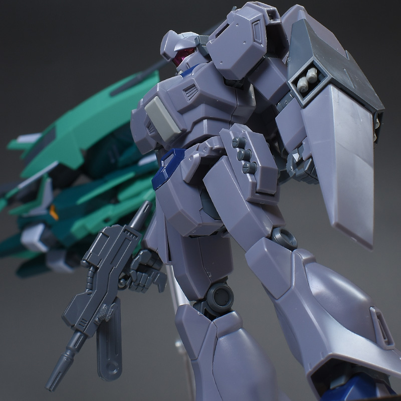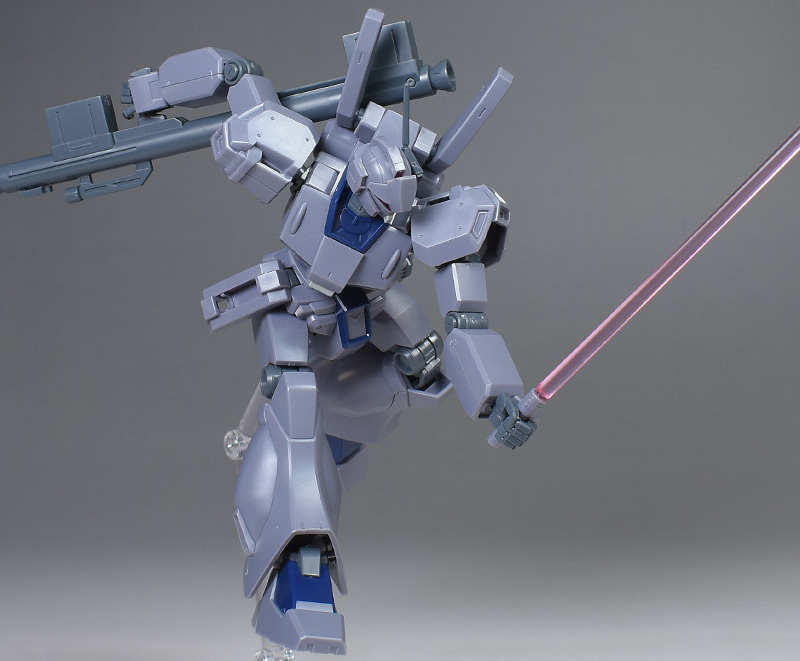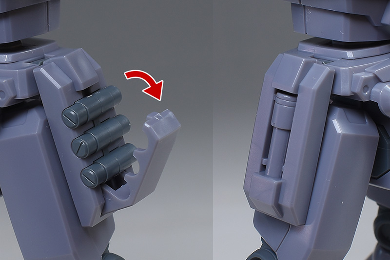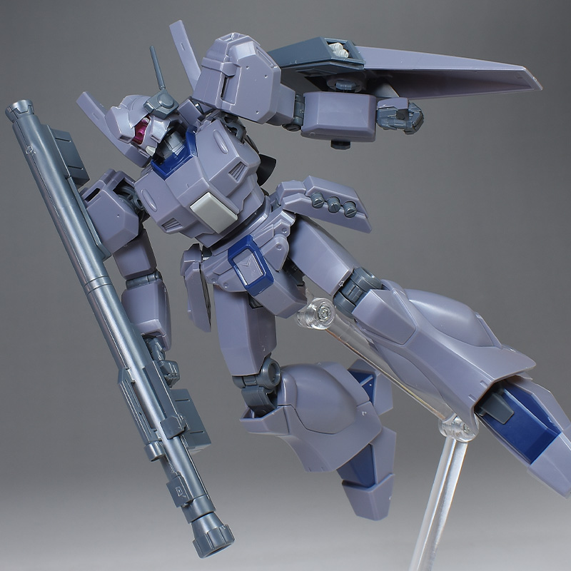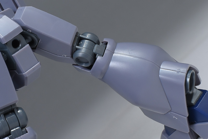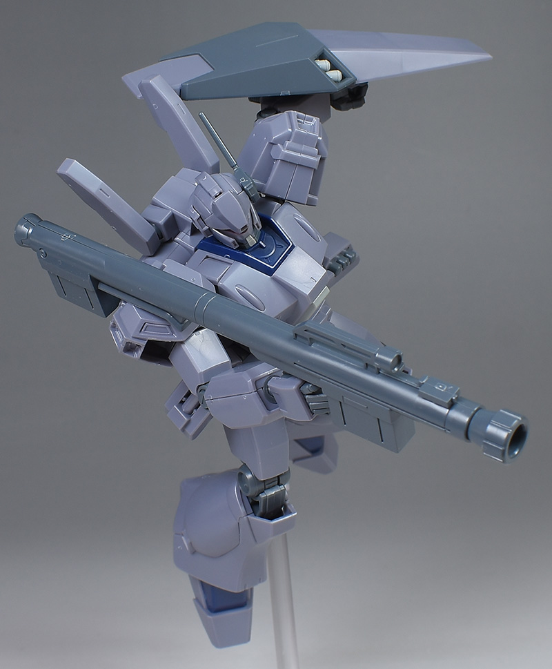 成形色は迷彩仕様特有のパープルグレーを基調に、襟や腰、脚甲などにダークブルー、顎や腹部、シールドのミサイル・ランチャーなどにライトグレーを配色。その他、内部・関節、各部バーニアや武装類がグレー成形色での再現となっています。
