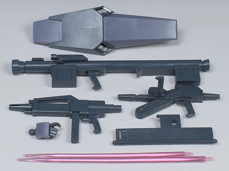 シールド、汎用バズーカ、ビームライフル(ジェガン用、マラサイ用)、武器持ち手(右)、ビームサーベル刃(短、長)、アイテム保管用のプレートが付属。