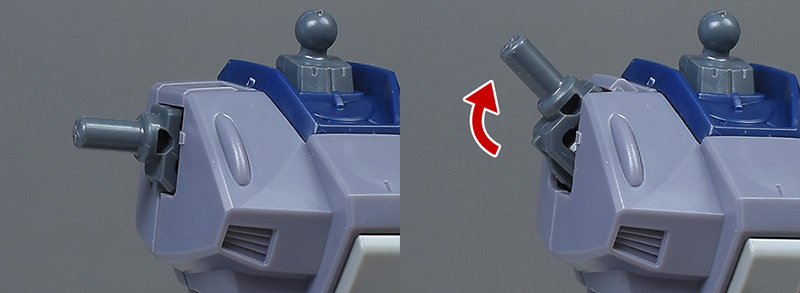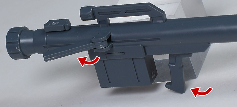 BR-78Aビーム・ライフルは他の武装とは違ってグリップにダボ固定がないため、ややふらつきやすいです。ですがフラフラというわけでもないのである程度安定した保持が可能。ハンドパーツから外れ落ちる心配はありません。
