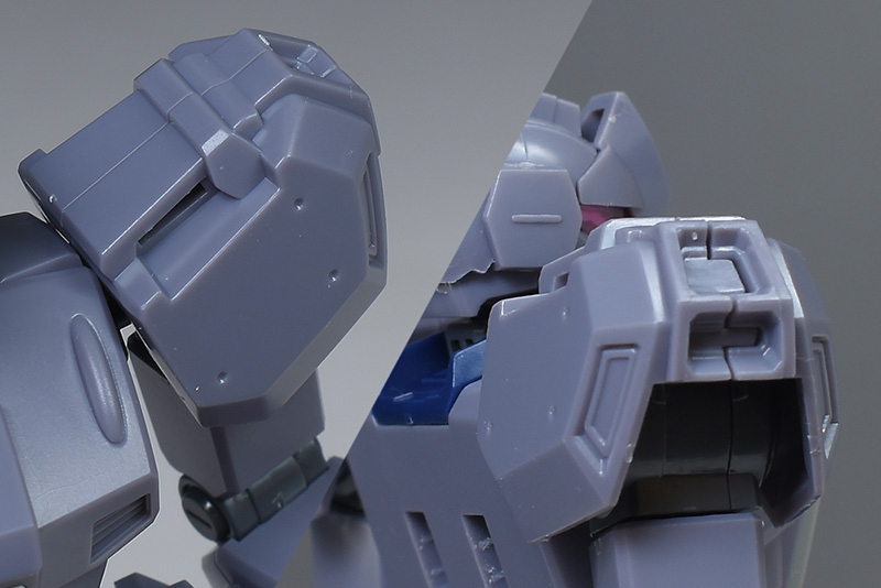ショルダーアーマーは前後の組み合わせで上部や側面に合わせ目ができます。内部パーツを挟むので、合わせ目を消す場合は後ハメなどの加工が必要。側面ダクトは起伏が細かいので合わせ目消しが難儀かも。