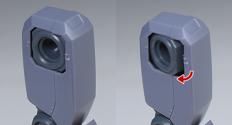 脚の付け根(ボールジョイント受け口)は少しスイングが可能。この可動によって脚部可動の自由度が少し増しています。