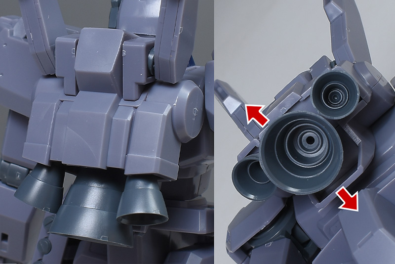 バックパック基部は前後の組み合わせで、側面の円形モールドの部分にのみ合わせ目ができます。下部にはスリットモールド入りの3基バーニアが造形。それぞれ別パーツでの色分けです。中央の大型バーニアはポリキャップ接続で少し上下に可動。