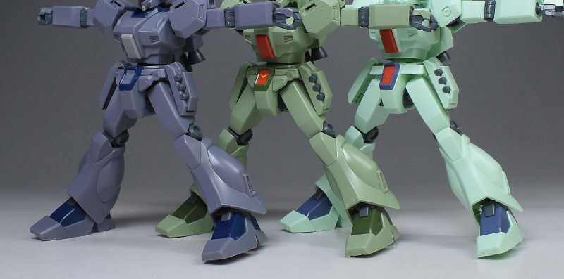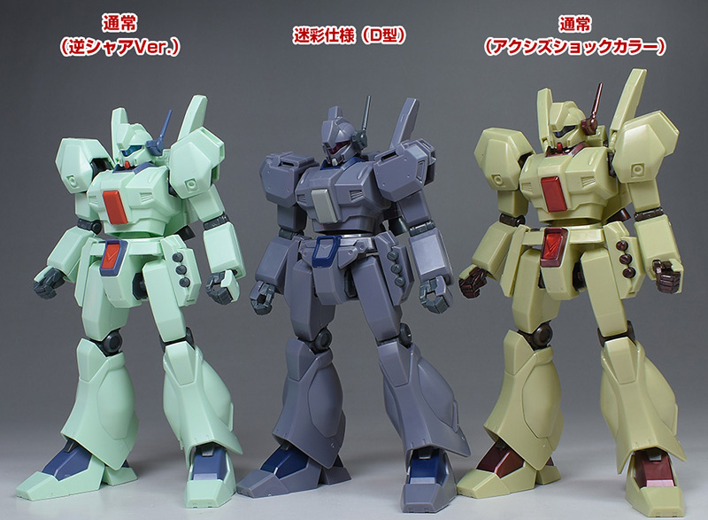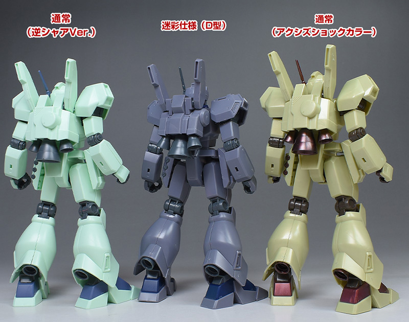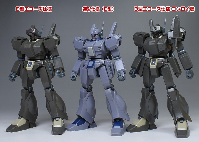 HGUC ジェガン(逆シャア版)、HGUCジェガン (アクシズショックイメージカラー)と並べて。迷彩仕様はD型なので、これら逆シャア登場機とは各部形状が細かく違っています。