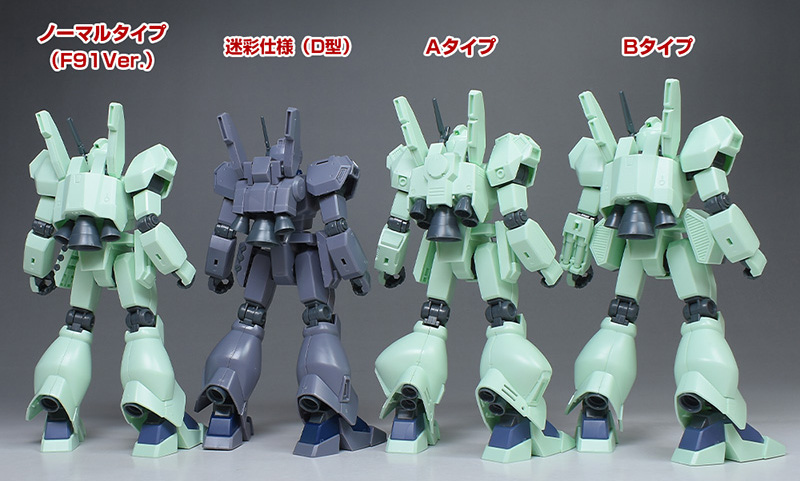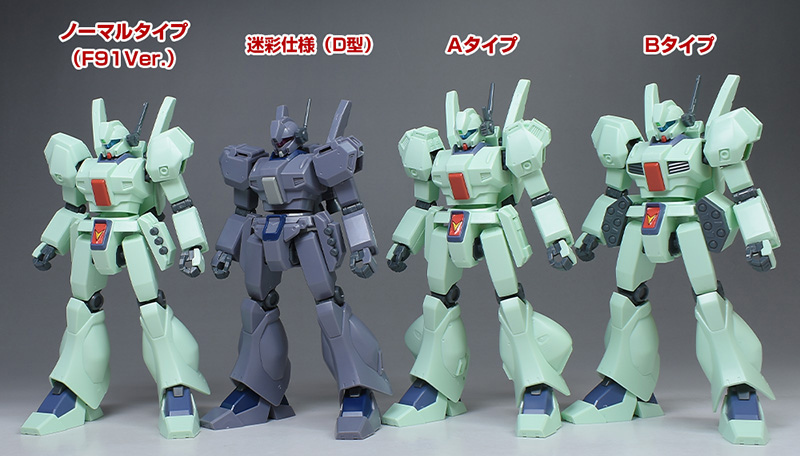 更にF91に登場したジェガン(HGUC ジェガンノーマルタイプ、HGUC ジェガン Aタイプ、HGUCジェガン Bタイプ)とも並べて。こちらとも各部が細かく違っています。