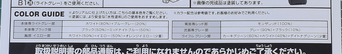 カラーガイド。色種は多くはなく調色も簡単です。ライフルの柄をグリーンで塗装するとミリタリー感が増すので参考にしたいところ。それと成形色が真っ黒なので、ダクトやバーニア内を赤で塗装する場合は下地塗装などしたほうが良さそうです。