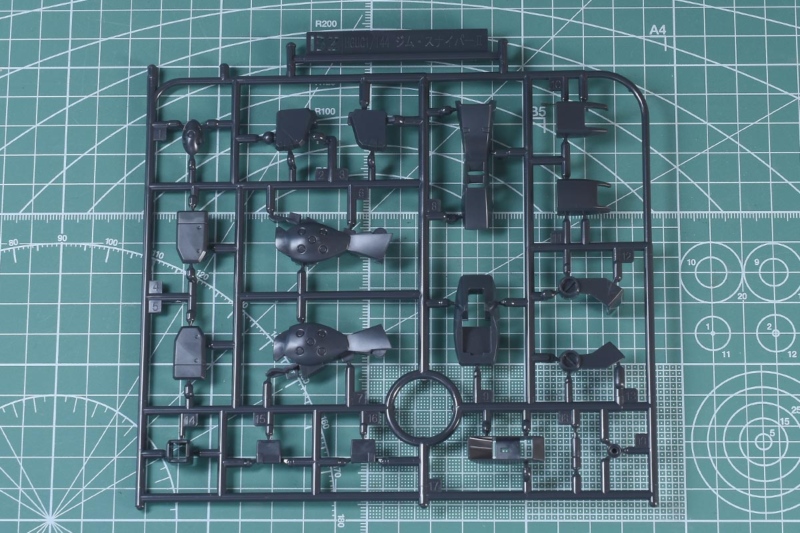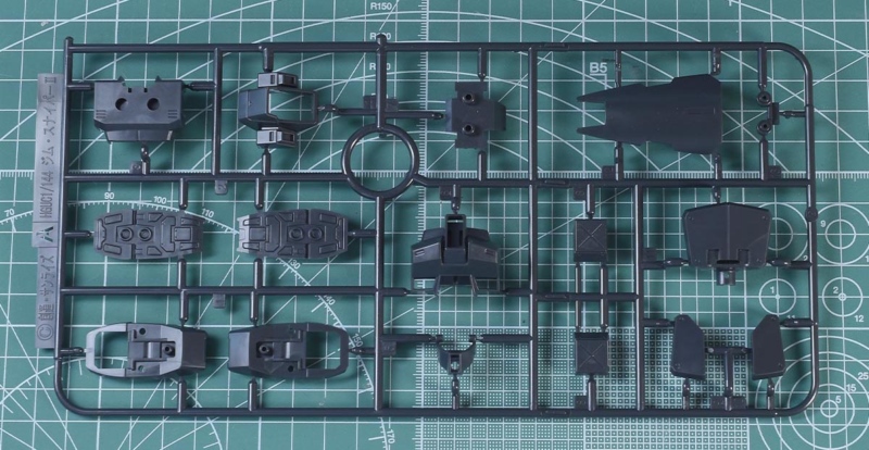 ↑Aランナー。ブラック(ダークグレー)成型色で、頭部や胴体部、脚部、ソール部、バックパックパーツ、シールドパーツなど。