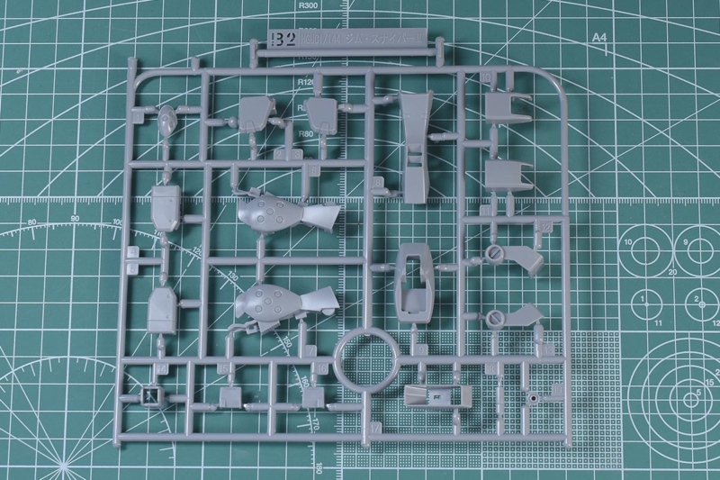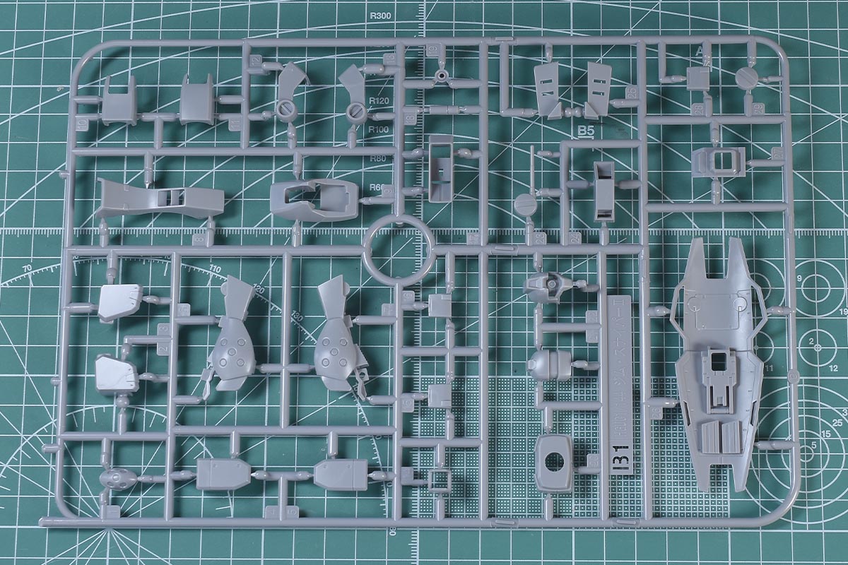 ↑B1、B2ランナー。ライトグレー成型色で、頭部や胴体部、腕部、脚部などの各部外装パーツ、シールドパーツなど。カラバリ用で左側のパーツの殆どは余剰になります。