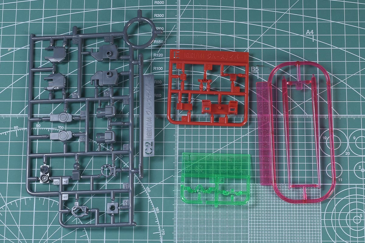 ↑C2、E、I、SB-6ランナー。C2はグレー成型色でC1の一部と同じ。Eはレッド成型色で、頭部や胴体部パーツ。Iはクリアグリーン成型色のセンサーやバイザーパーツ。SB-6はクリアピンク成型色のビームサーベル刃です。