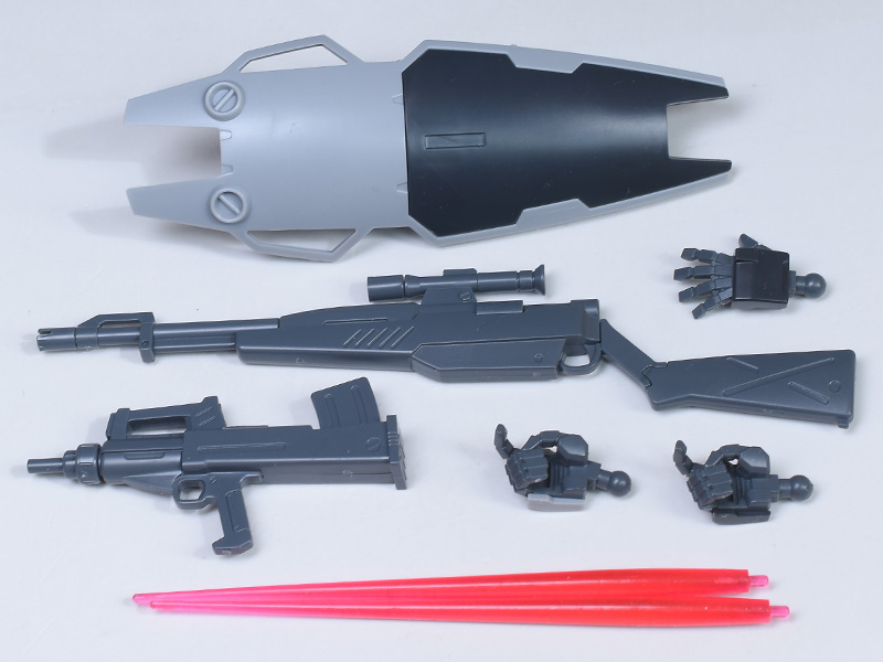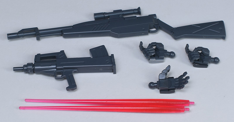 シールド、狙撃用ライフル、ビームサーベル刃✕2、プルバップ・マシンガン、武器持ち手✕2(狙撃ライフル用:右、プルバップマシンガン用:右)、平手(左)が付属。