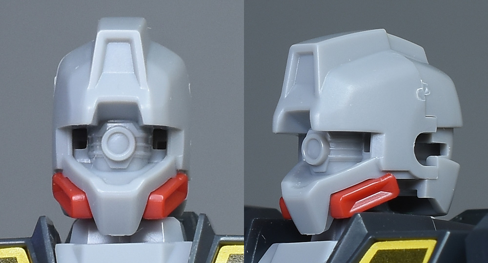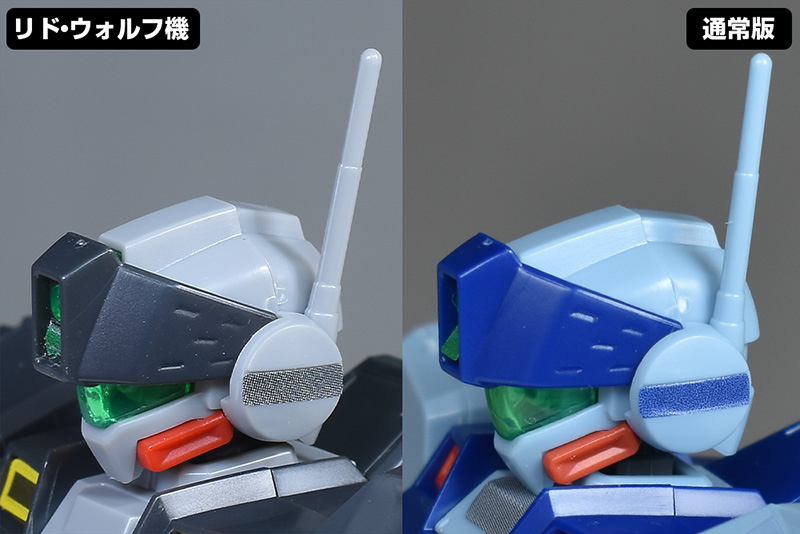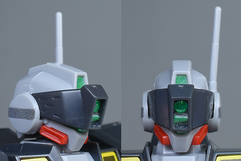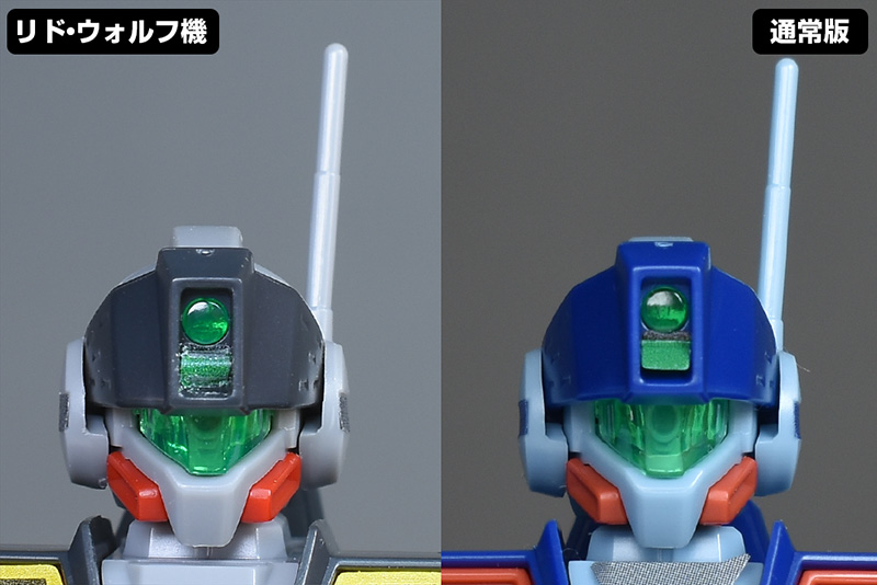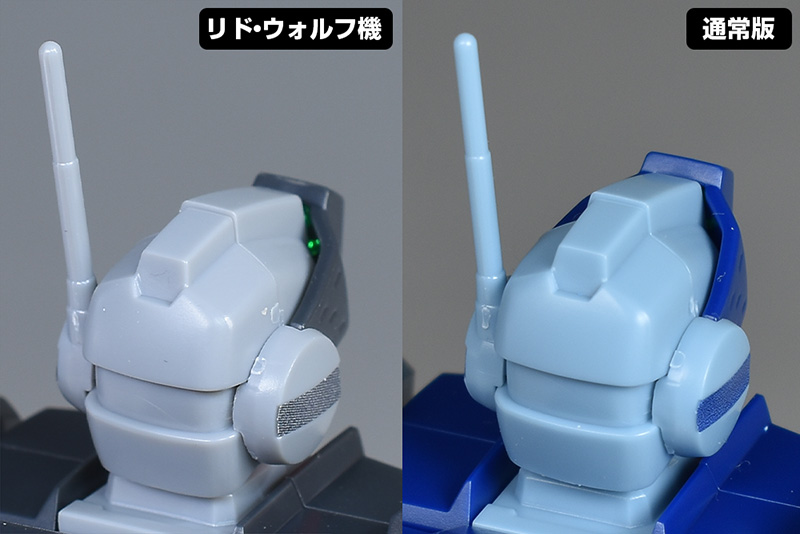 頭部を通常版と並べて比較。形状は全く同じ。成形色が違っているだけで配色も同じです。フェイスはクリアグリーンのカバーで覆われたジム・コマンドタイプで、額にはセンサー付きのバイザーが造形。狙撃専用機ではないですが、超長距離狙撃にも対応する特徴的な頭部形状が再現されています。