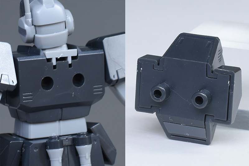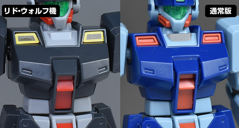 胸部・腹部を通常版と並べて。ジム・コマンド系のシャープでエッジの効いた装甲が造形。肩部ダクトや腹部コックピットハッチはパーツでの色分けですが、リド・ウォルフ機は肩ダクトを黄色のマーキングシールで色分けするようになっています。胸の小さなスリットダクトはレッド、首周りはダークグレーに塗り分けが必要。