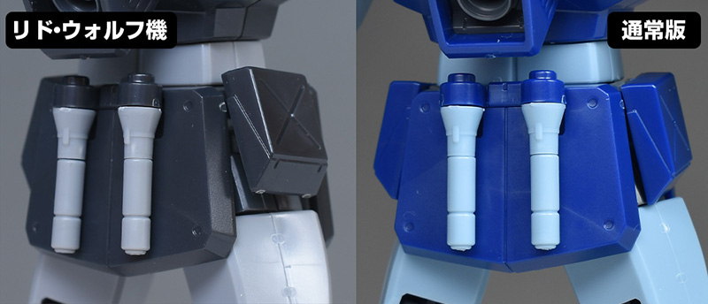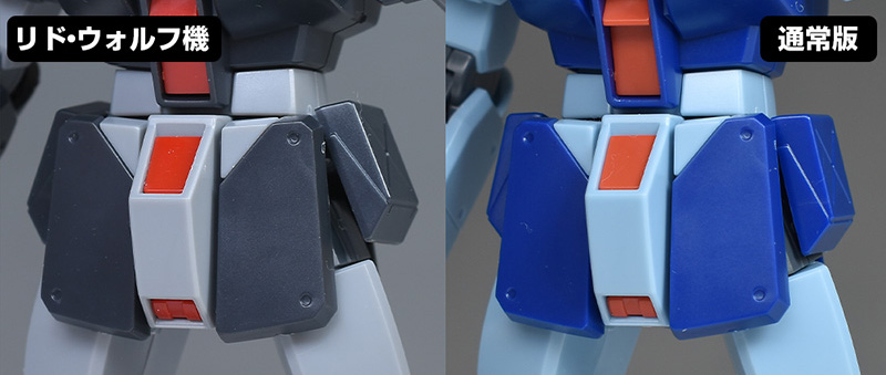 腰部を通常版と比較して。こちらは特に大きな違いはありません。成形色が違っているだけで配色は同じです。各面ともフラットな装甲が造形。リアアーマーにはサーベルホルダーを備えています。