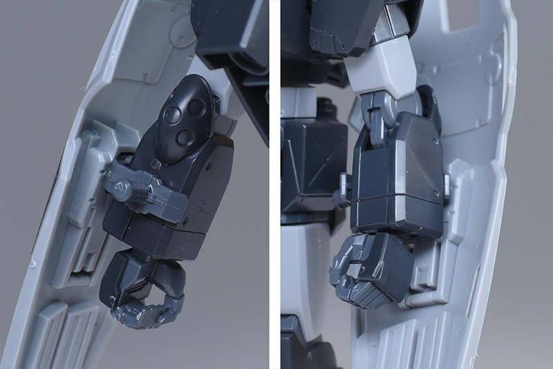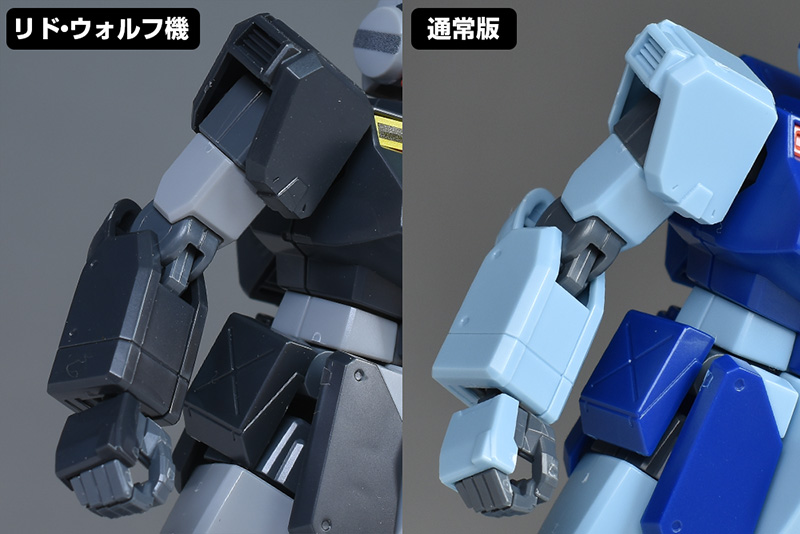 腕部を通常版と並べて。適度に太くエッジの効いた装甲が造形。動きやすさと強度を両立したような造りになっています。リド・ウォルフ機は配色が異なり、肩部と前腕部、手甲がダークグレーで締まりのある雰囲気に。