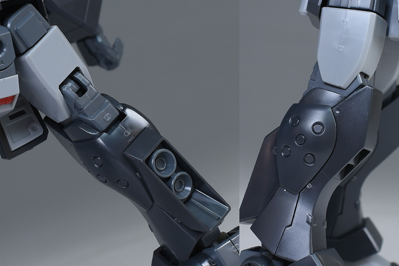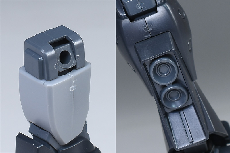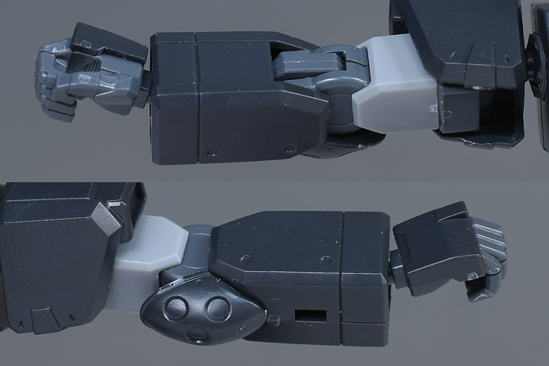 上腕は筒型で合わせ目はなし。前腕は左右の組み合わせで後面に合わせ目ができます。肘から分離しないので、合わせ目を消す場合は後ハメなどの加工が必要。肘の丸モールドが個性的で、ミリタリー調の雰囲気を醸し出しています。