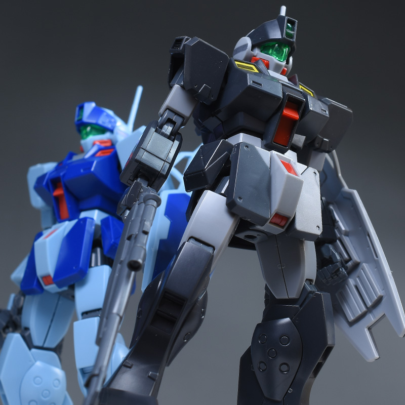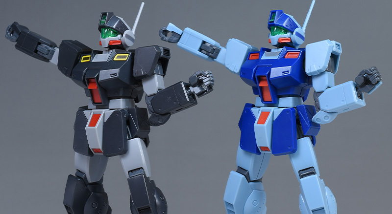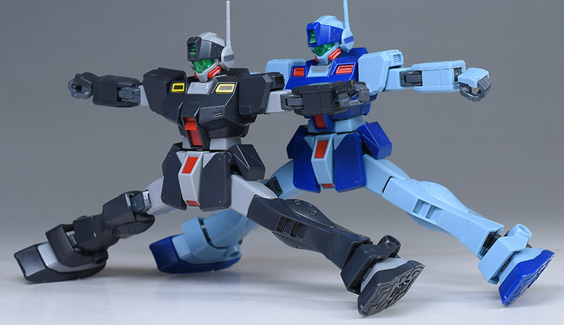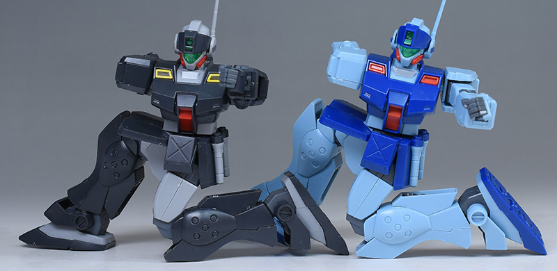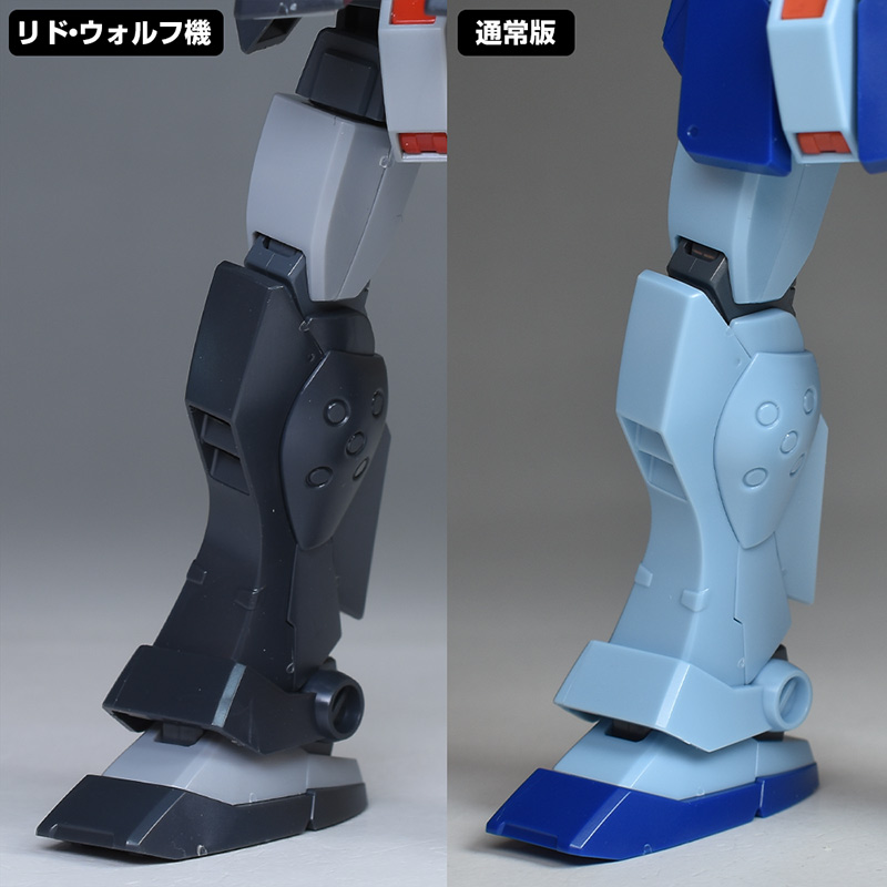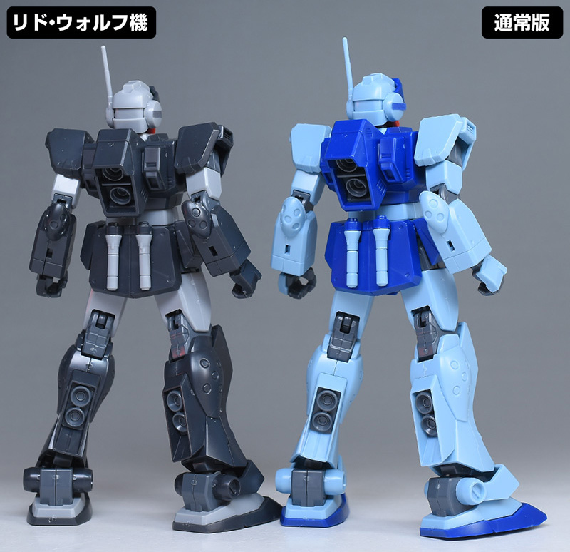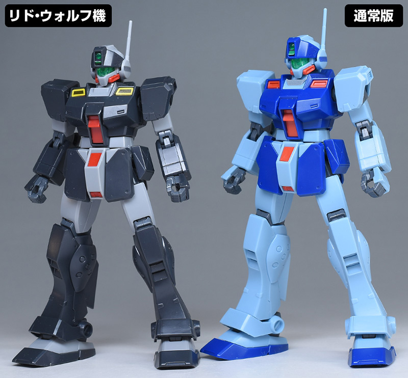 通常版(HGUC ジム・スナイパーⅡ)と並べて比較。造形は同じですが、リド・ウォルフ機は黒基調なのでヒール味というか、少し強そうな雰囲気が感じられますね。