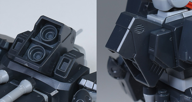 バックパック。こちらは配色も同じ。エッジの効いたメカニカルなバックパックになっています。後部の2口バーニアはふちをレッド、内部をホワイトなどに塗り分けが必要。左右の角型スラスターもふちをレッド、内部をダークグレーなどに塗り分けが必要です。