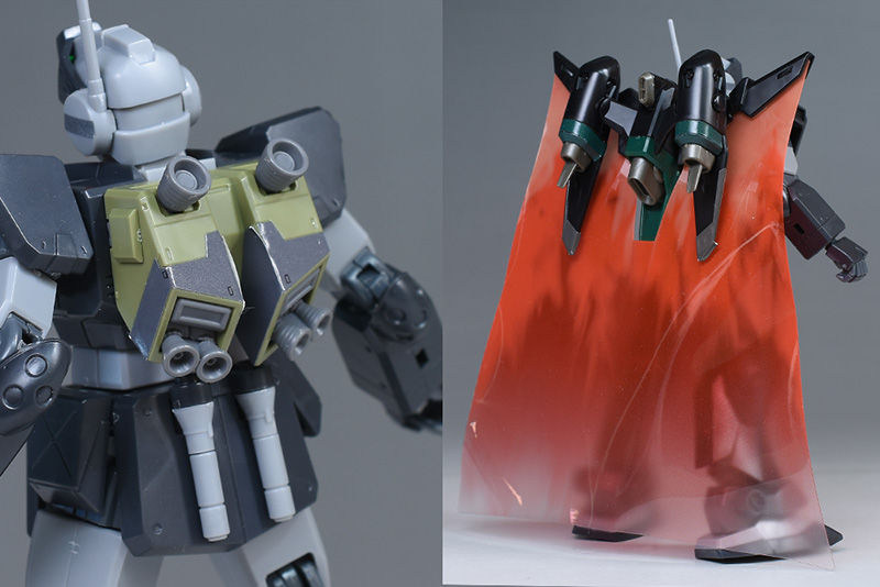 バックパックはHGUCや近年のガンプラで良く見られる2ダボ接続。なのでオリジン版ジムスナイパーカスタムのバックパックやHG SEED FREEDOMシリーズ、HG水星の魔女シリーズのバックパックなどとも交換可能です。