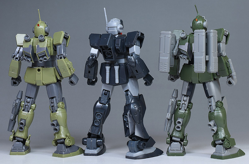 オリジン版であるHG ジムスナイパーカスタム、HG ジムスナイパーカスタム(ミサイル・ランチャー装備)とも並べて。オリジン版のジム系とは造形、プロポーション、デザイン全てが細かく違っています。オリジン版のジム・スナイパーⅡはまたキット化されていないので期待したいですね。