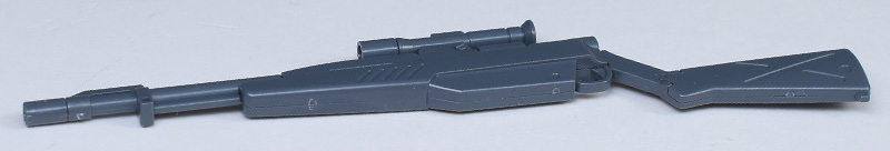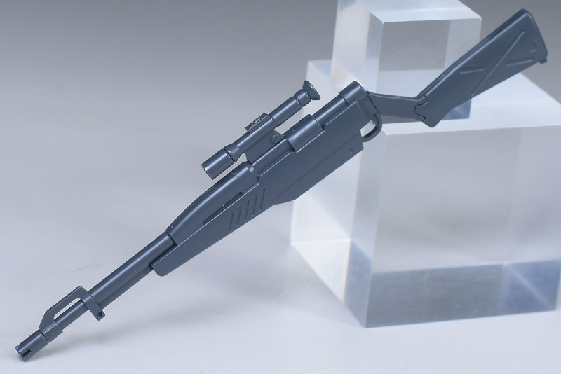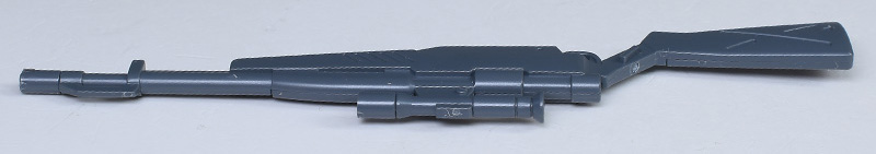 狙撃用ライフル(75mmスナイパー・ライフル)。MS用に開発された長射程の無反動砲です。ドイツ製のモーゼル・ボルトアクションライフル「kar98K」が手本になっているそう。グレー成型色のみでの再現なので、基部や後部ストックはミリタリー調のグリーンに塗り分けが必要です。