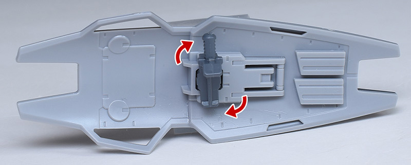 足の付根はポリキャップを交えた構造。ロールや上下スイングによって柔軟に可動します。後部の2基バーニアはグレーパーツでの色分けですが、内部を赤く塗り分けが必要。